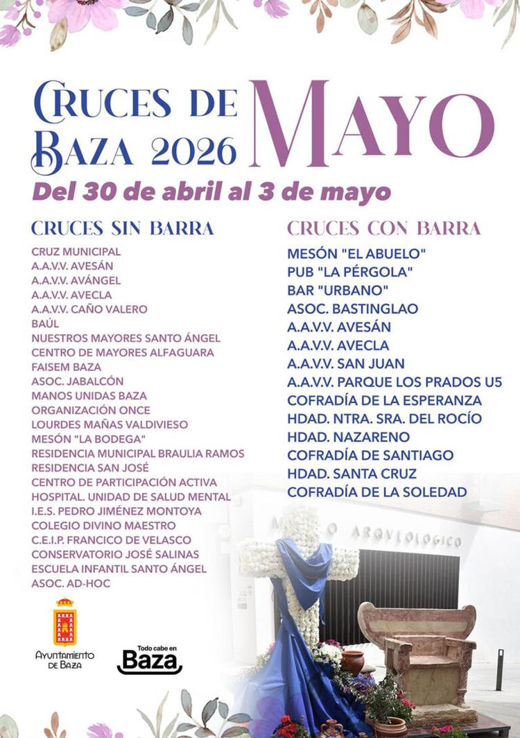 La ciudad de Baza se prepara un año más para celebrar por todo lo alto la popular Fiesta de la Cruz, que en esta edición de 2026 se extenderá del jueves 30 de abril al domingo 3 de mayo. 14 cruces se instalarán con barra en distintos puntos de la ciudad, mientras que otras 24 cruces han comunicado t