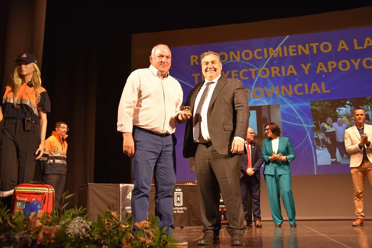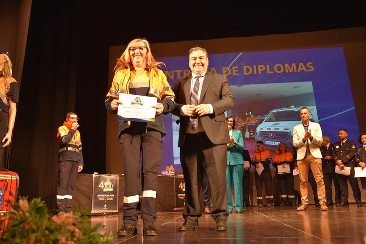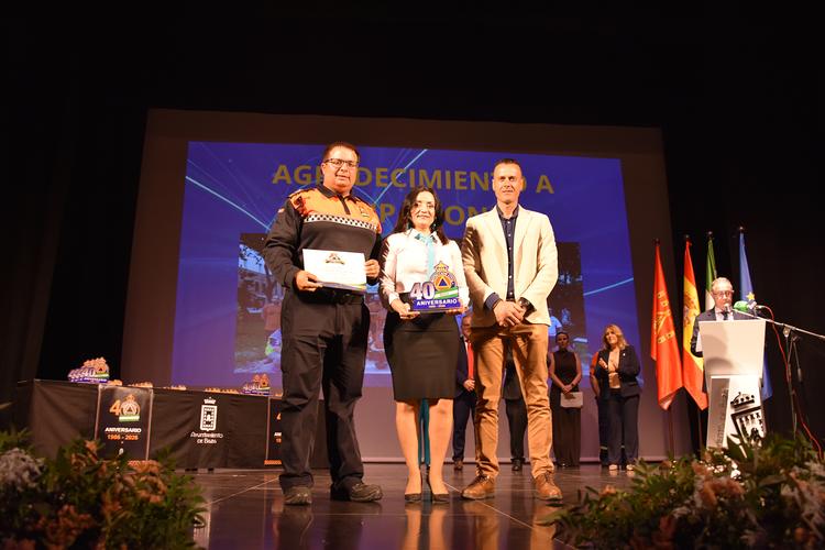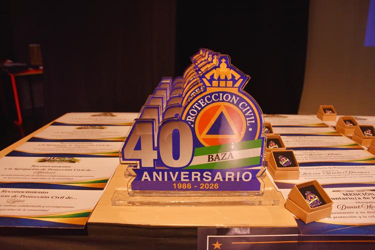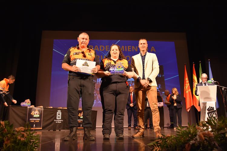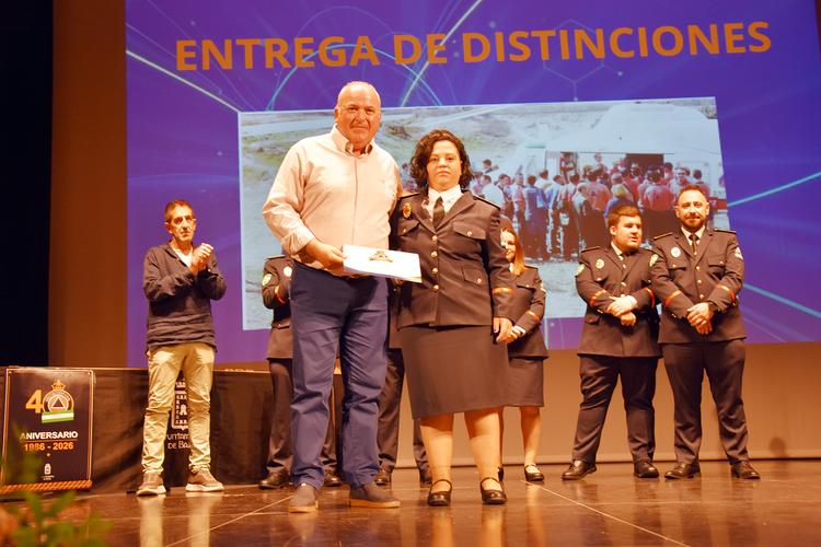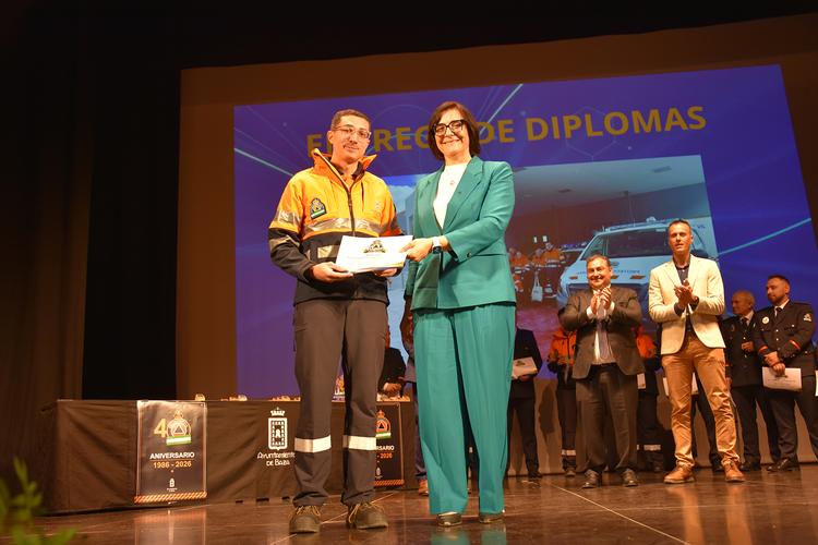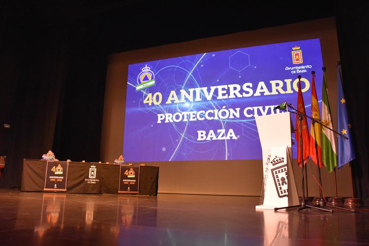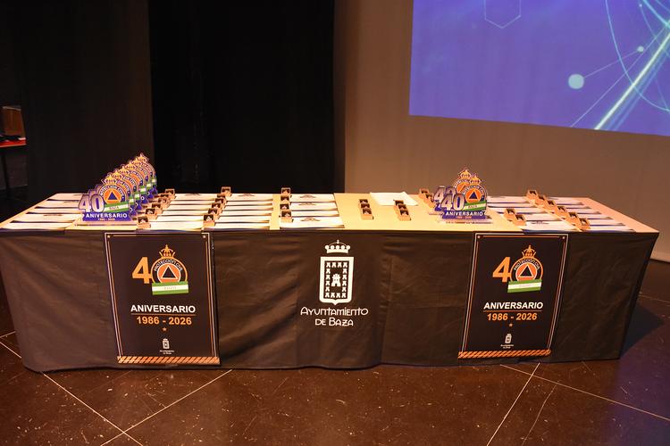 El teatro Dengra acogió en la mañana del domingo 19 de abril un emotivo acto institucional de homenaje y reconocimiento a la Agrupación de Voluntarios de Protección Civil, que en este 2026 celebra sus primeros cuarenta años de existencia. Presidido por el alcalde de Baza, Pedro J. Ramos, y por la concejala de Gobernación del Ayuntamiento, Mª Carmen Sánchez, el majestuoso espacio escénico reunió a gran parte de los actuales integrantes de la Agrupación, así como a antiguos componentes, cargos políticos municipales que han estado al cargo de este servicio, familiares y amigos. En representación de otras administraciones participaron la delegada territorial de Desarrollo Educativo en Granada de la Junta de Andalucía, Mª José Martín, el diputado provincial de Asistencia a Municipios y Emergencias, Eduardo Martos, y el Jefe del Servicio de Emergencias de la Diputación provincial, Sergio Jiménez. Entre los invitados estuvieron también algunos miembros de la corporación municipal bastetana, algunos alcaldes de la comarca y representantes de asociaciones y entidades de la ciudad.