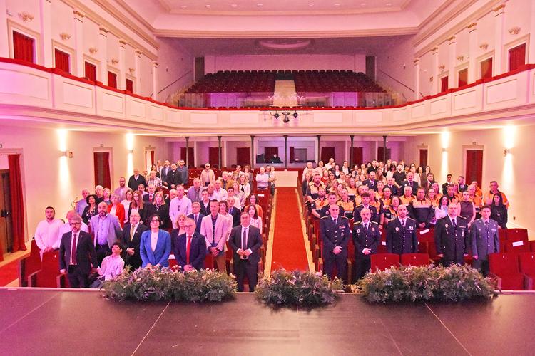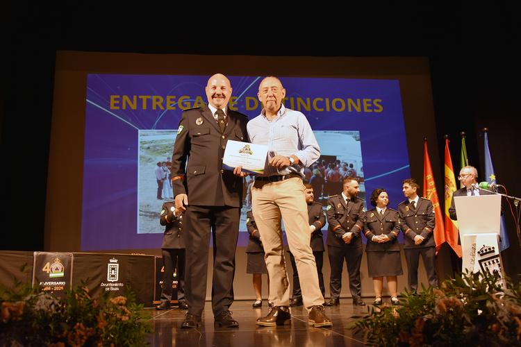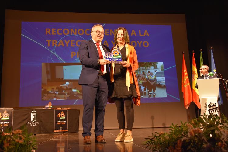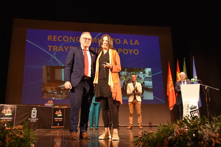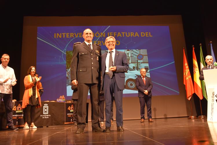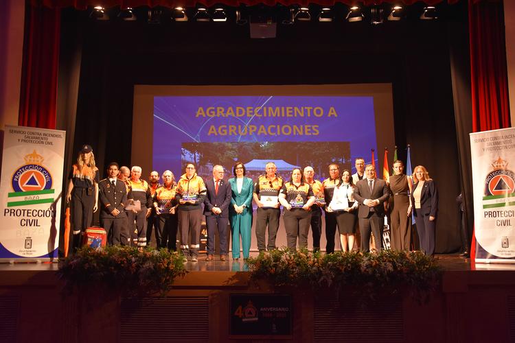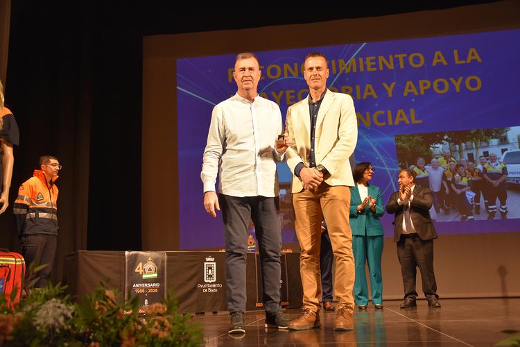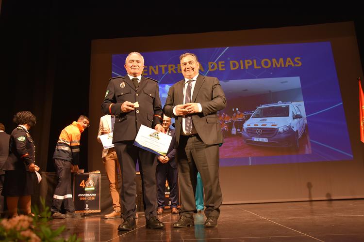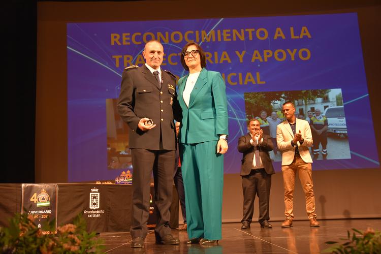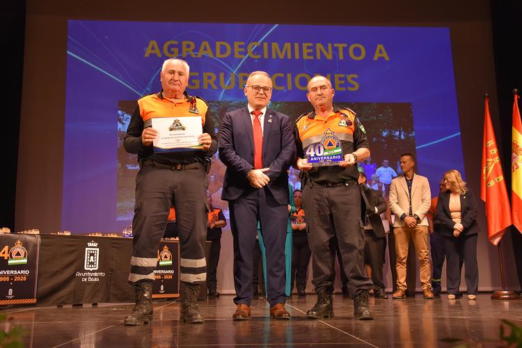 El teatro Dengra acogió en la mañana del domingo 19 de abril un emotivo acto institucional de homenaje y reconocimiento a la Agrupación de Voluntarios de Protección Civil, que en este 2026 celebra sus primeros cuarenta años de existencia. Presidido por el alcalde de Baza, Pedro J. Ramos, y por la concejala de Gobernación del Ayuntamiento, Mª Carmen Sánchez, el majestuoso espacio escénico reunió a gran parte de los actuales integrantes de la Agrupación, así como a antiguos componentes, cargos políticos municipales que han estado al cargo de este servicio, familiares y amigos. En representación de otras administraciones participaron la delegada territorial de Desarrollo Educativo en Granada de la Junta de Andalucía, Mª José Martín, el diputado provincial de Asistencia a Municipios y Emergencias, Eduardo Martos, y el Jefe del Servicio de Emergencias de la Diputación provincial, Sergio Jiménez. Entre los invitados estuvieron también algunos miembros de la corporación municipal bastetana, algunos alcaldes de la comarca y representantes de asociaciones y entidades de la ciudad.